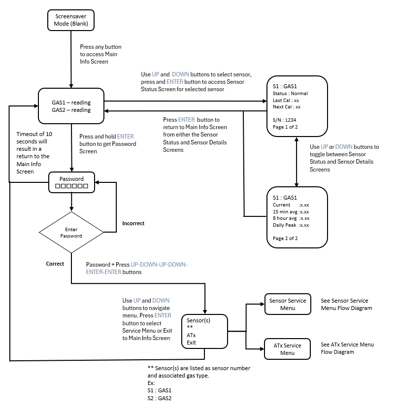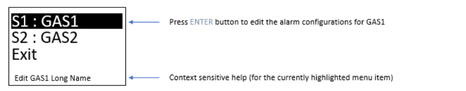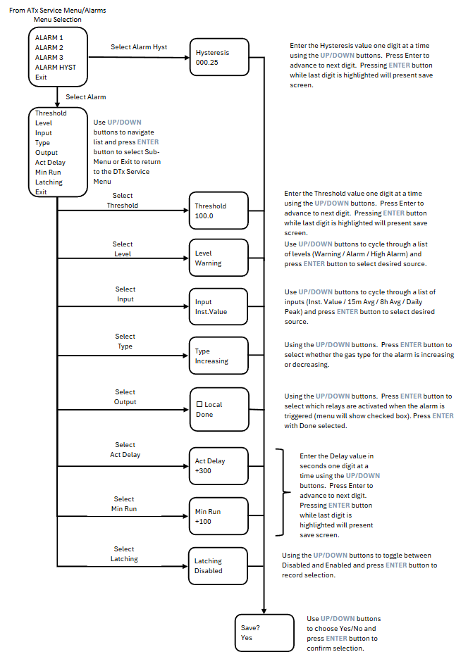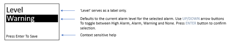 Each sensor can have up to three separate alarm levels associated with its gas reading. These alarms are evaluated is ascending order (Alarm 1 through Alarm 3) therefore, it is expected that the alarms are specified in descending order with respect to severity In the following table, the setpoint for each alarm is specified as well as the alarm level in parathesis (HA = High Alarm, A = Alarm, W = Warning, N = None).